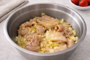 - Place the chicken pieces in a large bowl. Add the lemon juice, olive oil, garlic, onion, black pepper, salt (if using), and saffron.